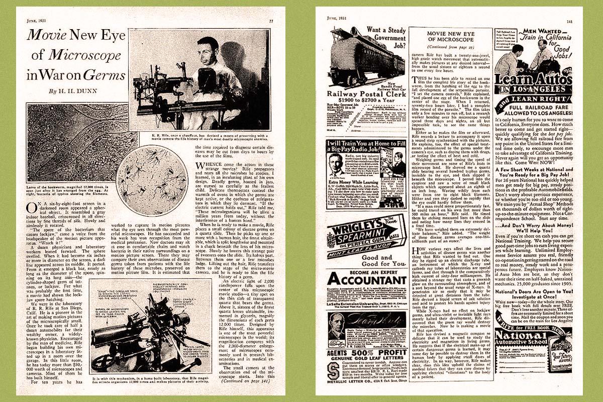 Με το universal microscope του Rife, οι δυναμικές λειτουργίες της ζωής του ιού μπορούσαν να παρατηρηθούν χωρίς να τον σκοτώσουμε. Με το μικροσκόπιο του Rife, μια ολόκληρη γκάμα πολύπλοκων οργανισμών και δομών κάτω από το μέγεθος των βακτηρίων αποκαλύφθηκε.