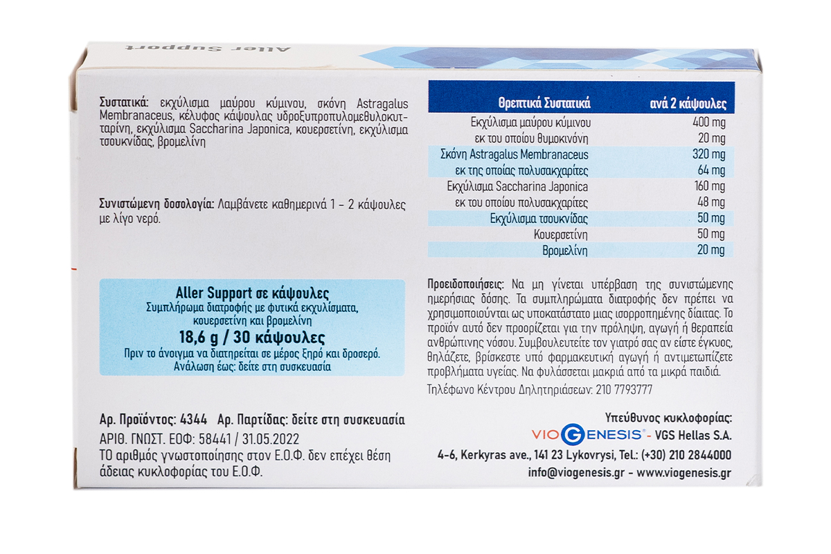 Βασικά συστατικά: εκχύλισµα μαύρου κύμινου, σκόνη Astragalus Membranaceus, εκχύλισμα Sophora Japonica, κουερσετίνη, εκχύλισμα τσουκνίδας, βρομελίνη.