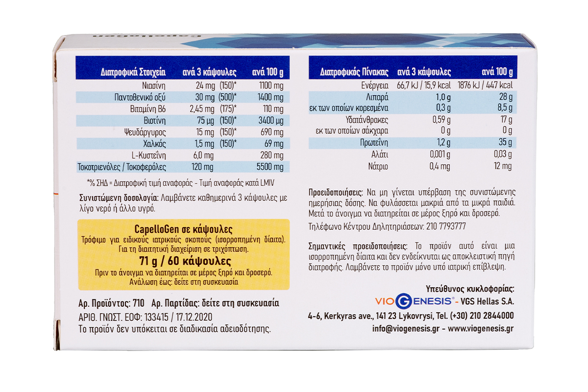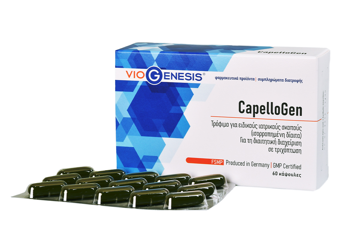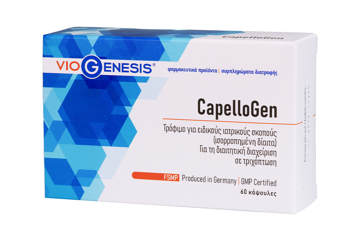 To CapelloGen είναι ένα διαιτητικό προϊόν το οποίο ανήκει στην κατηγορία των τροφίμων για ειδικούς ιατρικούς σκοπούς (ισορροπημένη δίαιτα) και προορίζεται για την διαιτητική διαχείριση σε τριχόπτωση.