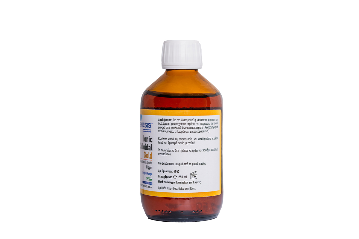 Συσκευασία: 250 ml διαλύματος χρυσού εμφιαλωμένο σε καφέ γυάλινη φιάλη