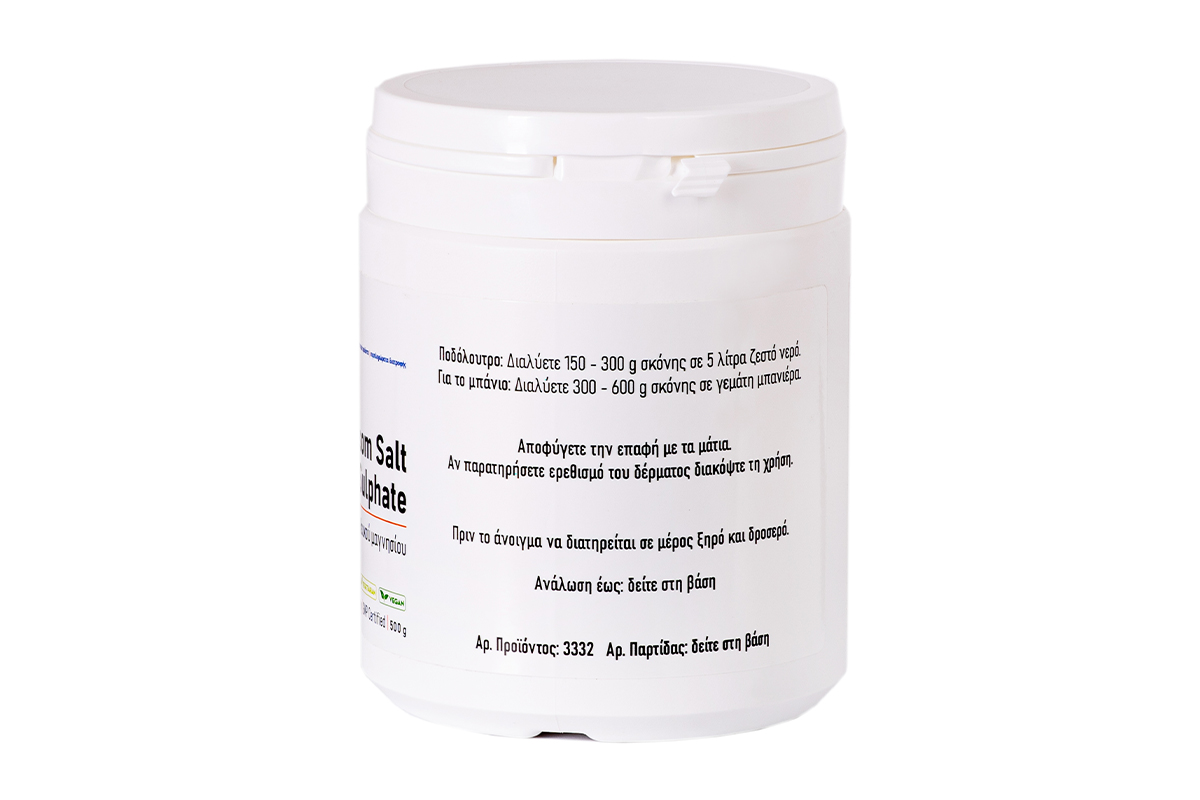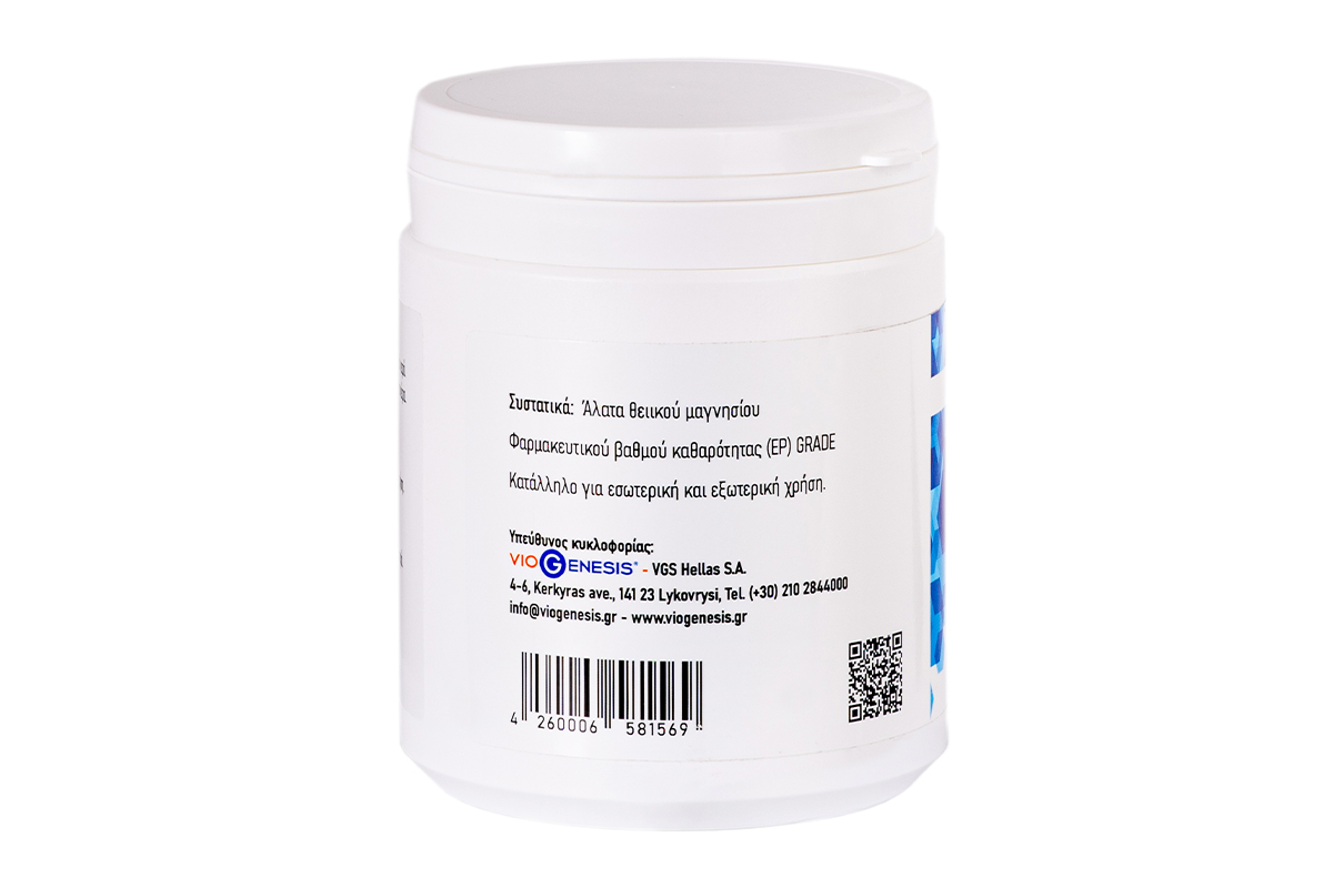 Άλατα θειικού μαγνησίου βρώσιμα. Φαρμακευτικού βαθμού καθαρότητας. Υπεροσμωτική δράση. Εξυγίανση και αποτοξίνωση του δέρματος σε χρήση εξωτερική. Μυοχαλαρωτικό σε χρήση λουτρού. Βασική πρώτη ύλη.