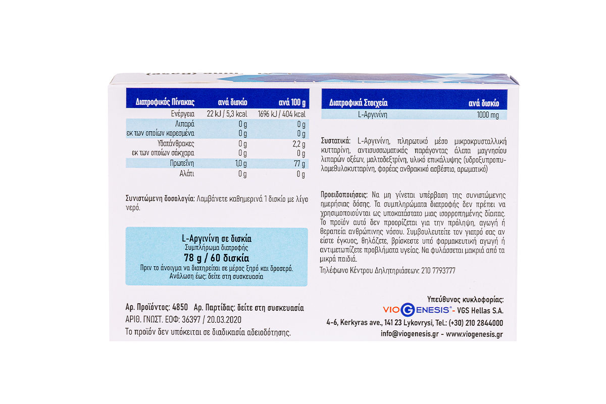 ![L-Arginine [BASE] 1000 mg 60 tabs - Image 3](https://elitehealth.gr/wp-content/uploads/2022/03/VioGenesis-L-Arginine-60-tabs-box-cells-back.jpg)