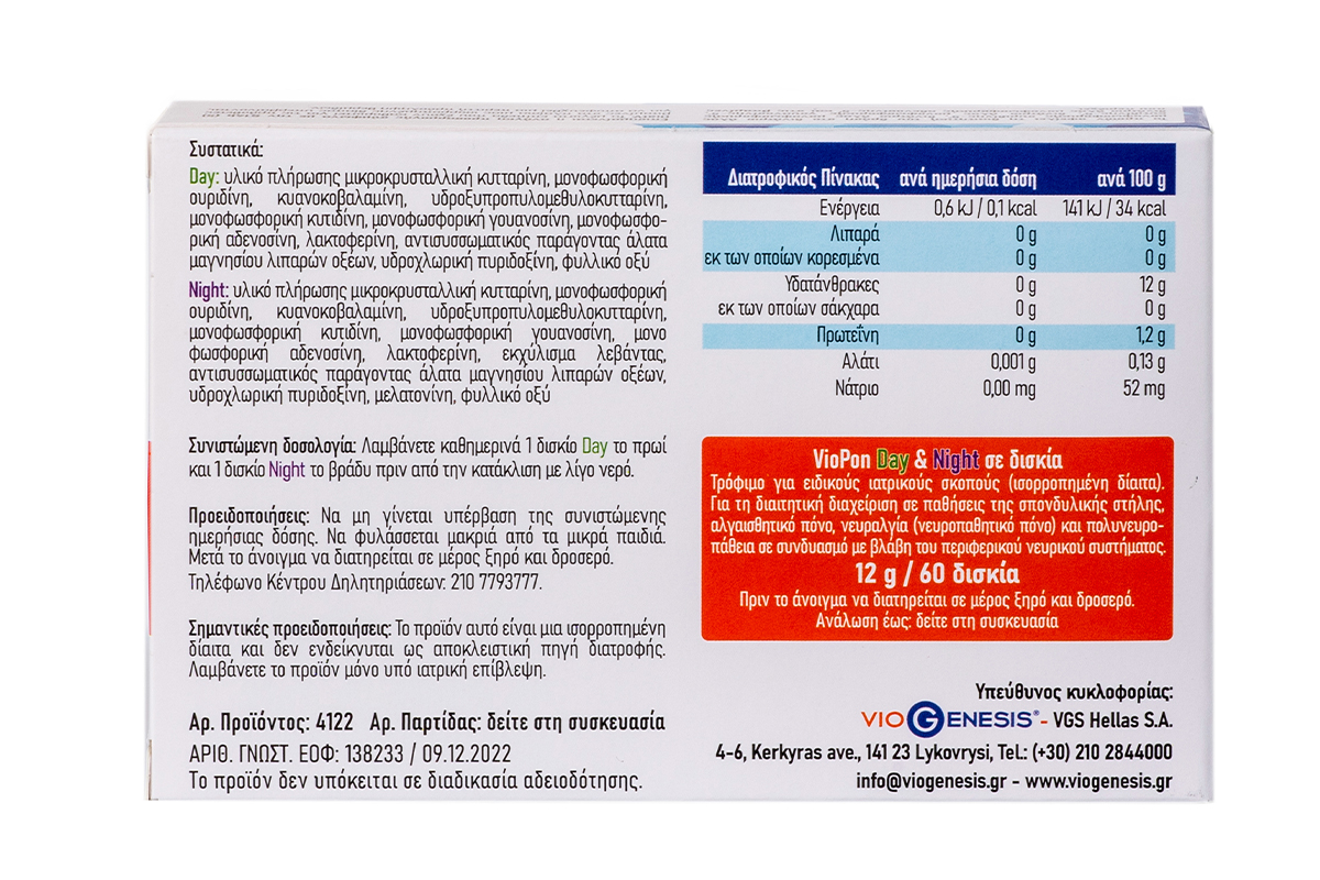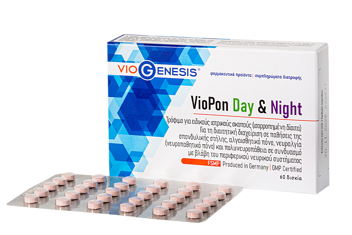 To VioPon Day & Night είναι ένα διαιτητικό προϊόν το οποίο ανήκει στην κατηγορία των τροφίμων για ειδικούς ιατρικούς σκοπούς (ισορροπημένη δίαιτα) και προορίζεται για τη διαιτητική διαχείριση σε παθήσεις της σπονδυλικής στήλης, αλγαισθητικές παθήσεις, νευραλγία (νευροπαθητικοί πόνοι) και πολυνευροπάθεια σε συνδυασμό με βλάβη του περιφερικού νευρικού συστήματος.