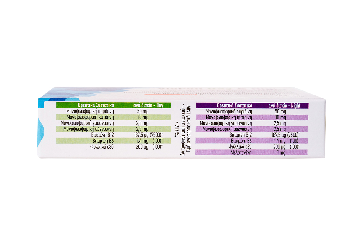 Βασικά συστατικά Night: μονοφωσφορική ουριδίνη, κυανοκοβαλαμίνη, μονοφωσφορική κυτιδίνη, μονοφωσφορική γουανοσίνη, μονοφωσφορική αδενοσίνη, λακτοφερίνη, εκχύλισμα λεβάντας, υδροχλωρική πυριδοξίνη, μελατονίνη, φυλλικό οξύ.