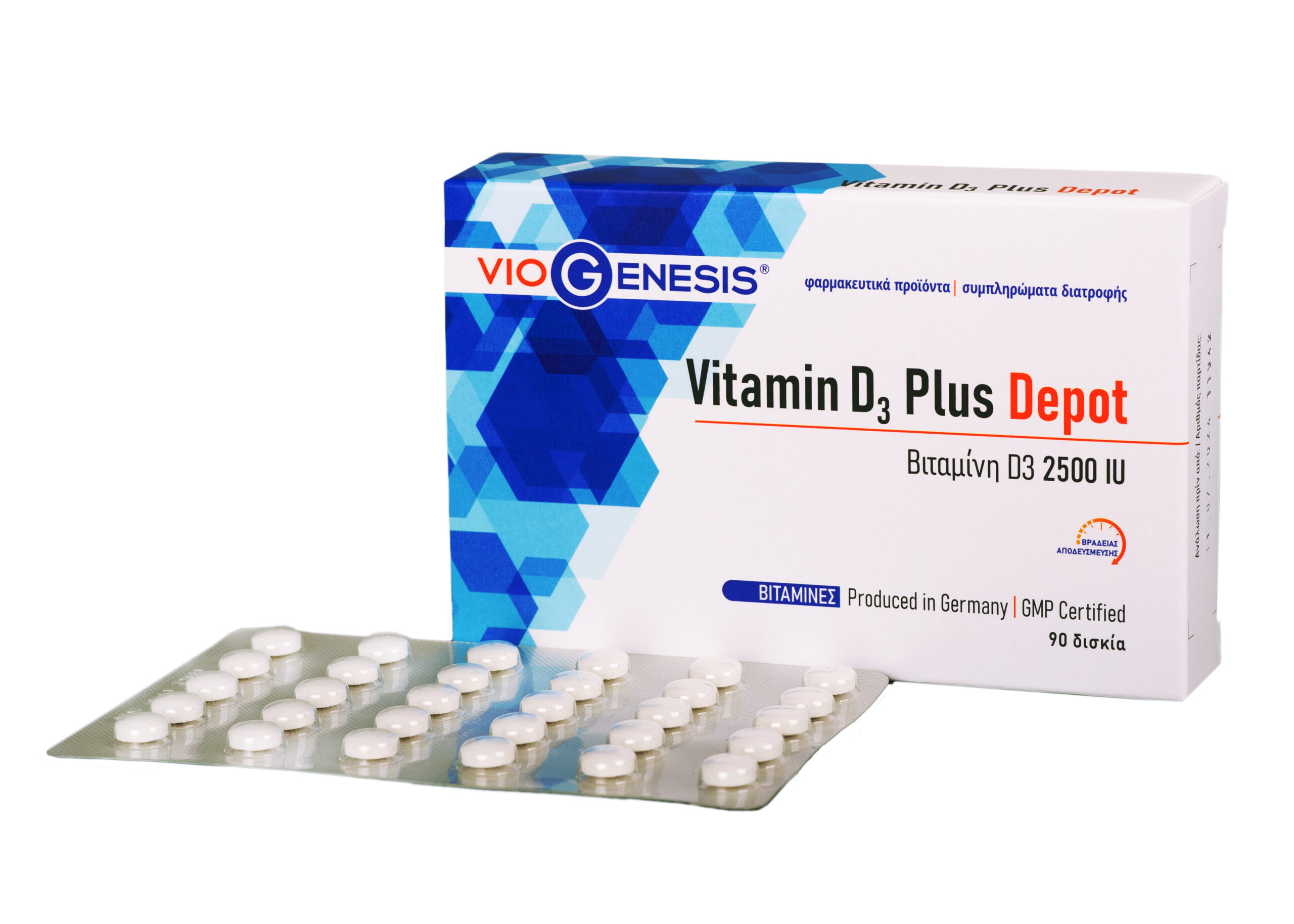 To συµπλήρωµα διατροφής Vitamin D3 Plus Depot 2500 IU περιέχει βιταµίνη D3 ενισχυµένη µε βιταµίνη C και ψευδάργυρο, φαρµακοτεχνικής µορφής δισκίων DEPOT.